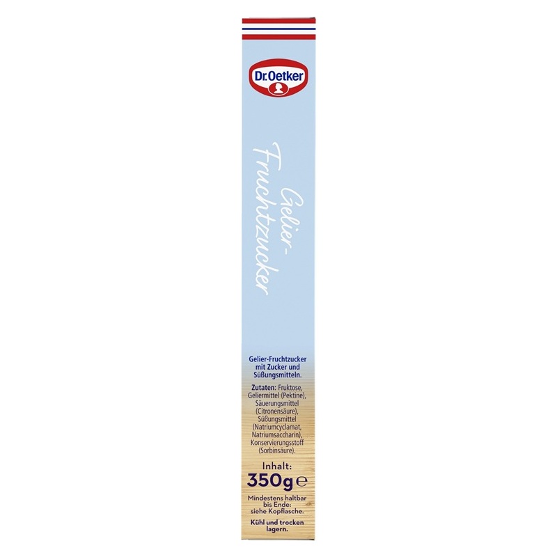 In Dr. Oetker Gelier-Fruchtzucker wurde ein Teil des Zuckers reduziert und durch Süßstoffe ersetzt. So können Sie damit fruchtig süße, aber um 40% kalorienreduzierte Konfitüren, Marmeladen und Gelees selber machen. Die ausgewogene Mischung auf Fruchtzuckerbasis ermöglicht auch Kalorienbewussten einen süßen Konfitürengenuss. Pro Packung Gelier-Fruchtzucker (350g) benötigen Sie 1000g vorbereitete Früchte bzw. 900ml Saft. Der Gelier-Fruchtzucker enthält das pflanzliche Geliermittel Pektin, das aus Zitrusfrüchten gewonnen wird. Da Geliermittel und Fruchtzucker bereits gemischt sind, ist die Zubereitung besonders schnell und einfach.