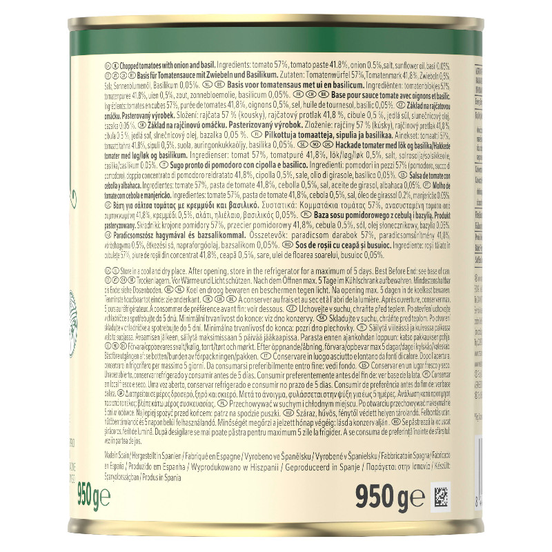 Zutaten: Tomatenwürfel 57%, Tomatenmark 41,8%, Zwiebeln 0,5%, Salz, Sonnenblumenöl, Basilikum 0,05%