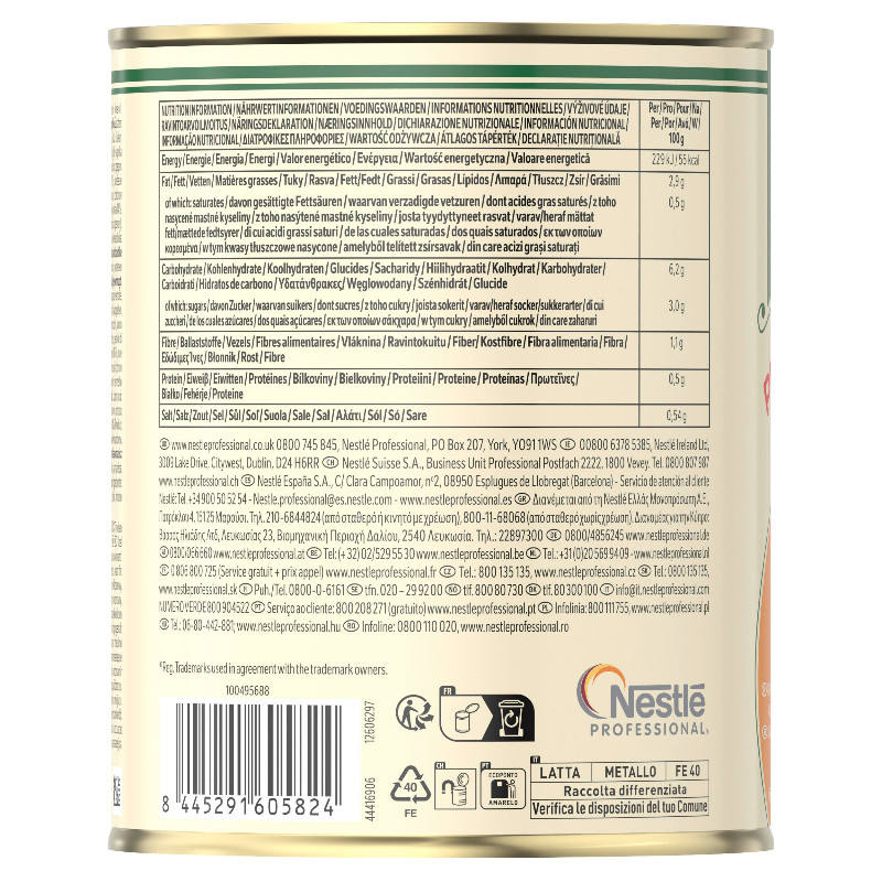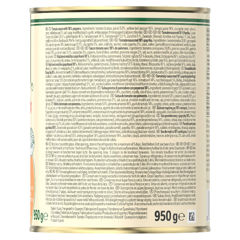 Zutaten: Tomatenstückchen 39,8 %, gelbe Paprika 16 %, Tomatenmark 14%, Tomatensaft 13,1 %, Zucchini 5 %, Zwiebeln, Olivenöl, Karotten, rote Paprika 2 %, Salz, Zucker, modifizierte Stärke, Knoblauch, Pfeffer, Festigungsmittel Calciumchlorid