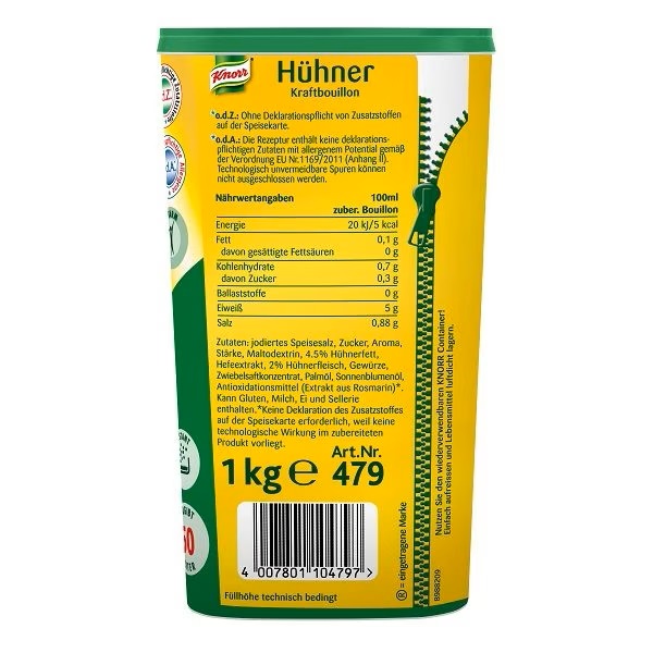 Zutaten: Jodiertes Speisesalz, Aroma, Zucker, Stärke, Maltodextrin, 4,5% Hühnerfett, Speisesalz, Hefeextrakt, 2% Hühnerfleisch, Gewürze, Zwiebelsaftkonzentrat, Sonnenblumenöl, Antioxidationsmittel (Extrakt aus Rosmarin)². Kann Spuren von Gluten, Ei, Milch, Sellerie, Senf und Soja enthalten. ²Keine Deklaration des Zusatzstoffes auf der Speisekarte erforderlich, weil keine technologische Wirkung im zubereiteten Produkt vorliegt.