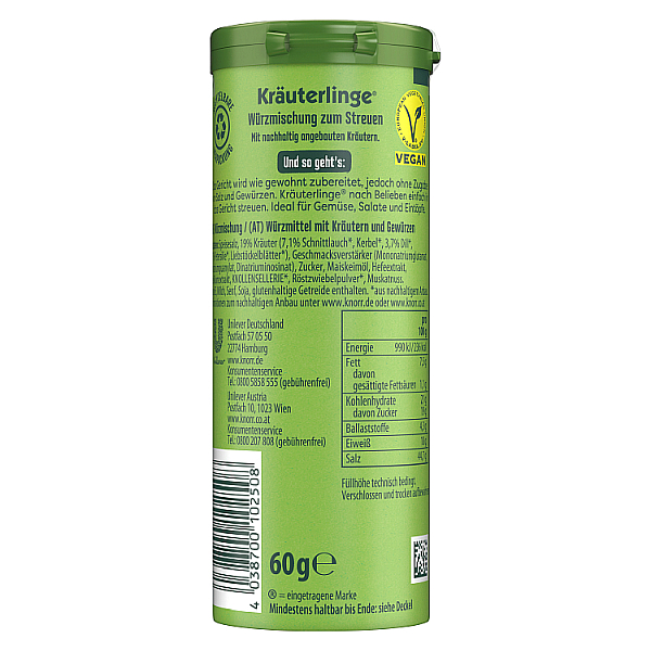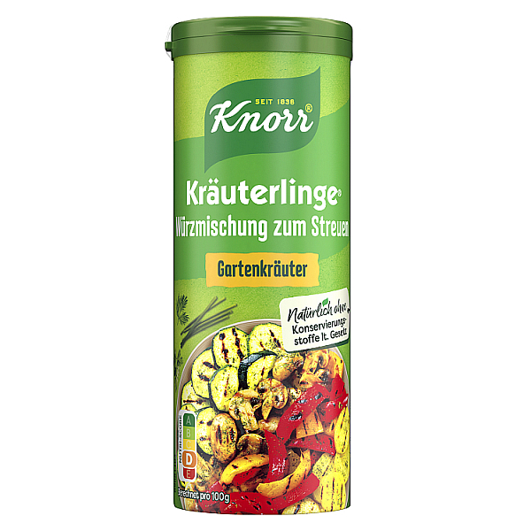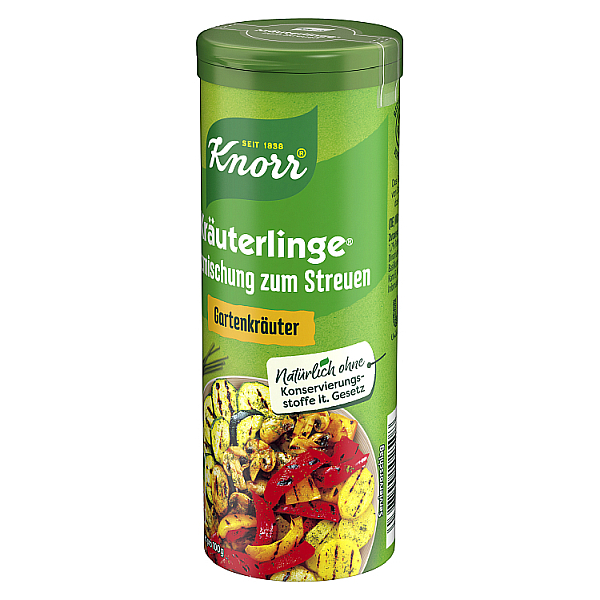 Das harmonische Kräuterbouquet mit Schnittlauch, Dill und Petersilie, fein abgestimmt mit Knoblauch und erlesenen Gewürzen. KNORR Kräuterlinge Gartenkräuter passen ideal zu Salat, Gemüse, Nudelauflauf und Eiergerichten. Einfach anstelle von Salz und Gewürzen in das Gericht streuen – fertig.