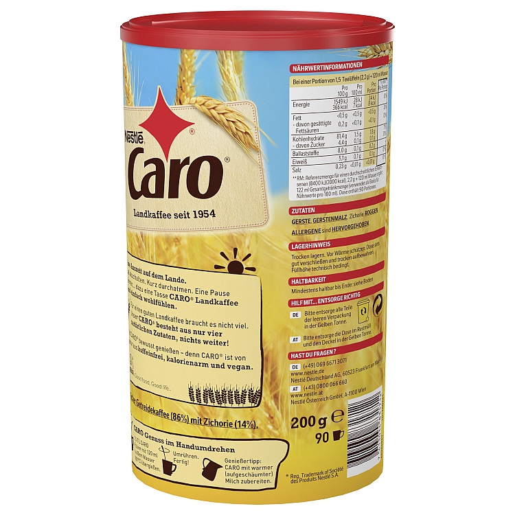 CARO besteht zu 100% aus Zutaten natürlicher Herkunft: Gerste, Gerstenmalz, Zichorie sowie Roggen. Zudem steht CARO für natürlichen und unbeschwerten Genuss, denn es ist - koffeinfrei - fettfrei - zuckerarm. Bereits seit über 50 Jahren gibt es CARO in der bewährten Rezeptur. Der besondere Caro Genießertipp - einfach mit Milch zubereiten! Ab sofort bietet CARO zudem mit CARO & Kaffee im 200g Beutel, Genießern Bestes aus zwei Welten: Den natürlichen Genuss, wie man ihn von CARO kennt und das Aroma von 25% löslichem Bohnenkaffee.